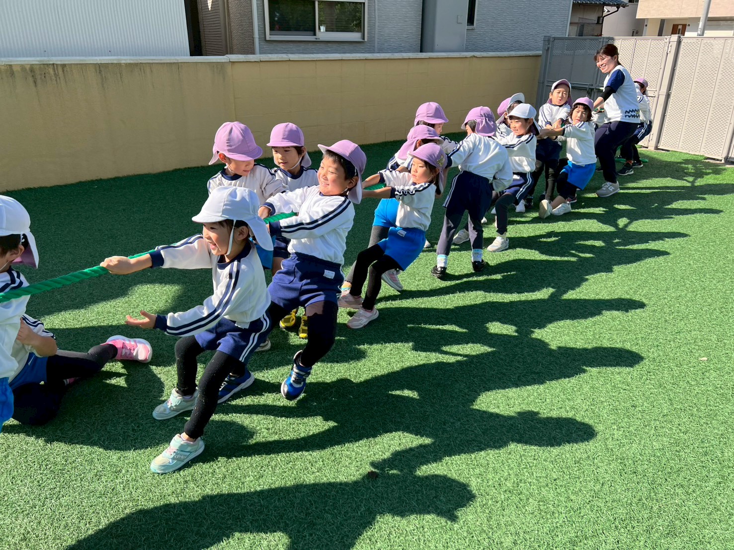 給食室の先生にカレーを煮込んでもらっている間、園庭で綱引きとリレーを楽しみました!